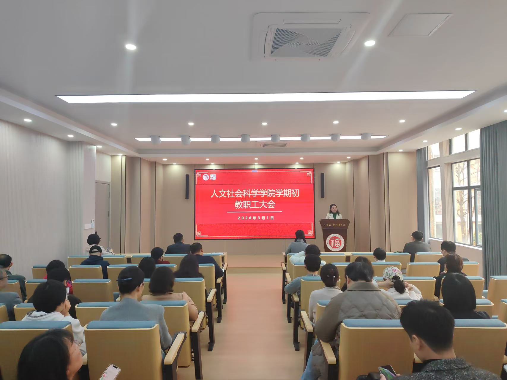 学期初全院教职工大会在学院213报告厅举行。会议由学院党委书记刘玮主持,学院党政领导班子全体成员及全院教职工参加会议。