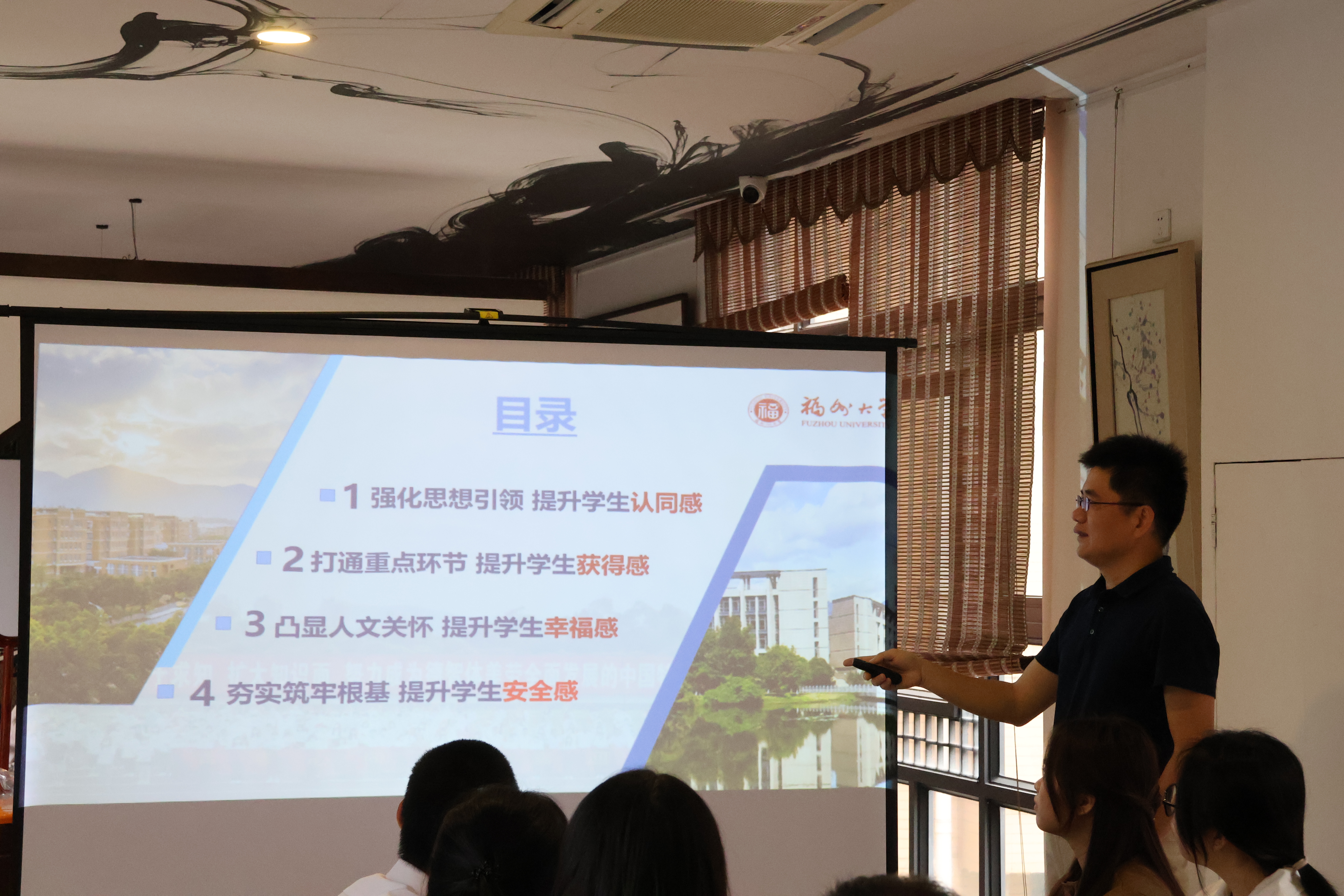 会议伊始,学院党委副书记陈永福介绍了学院学生工作情况,围绕大型大学生沉浸式戏剧《嘉木留芳》、学生劳动实践基地建设、传统文化育人经验、以心理情景剧为切入的心理育人服务等特色工作,介绍人文学院的创新成果和典型经验。