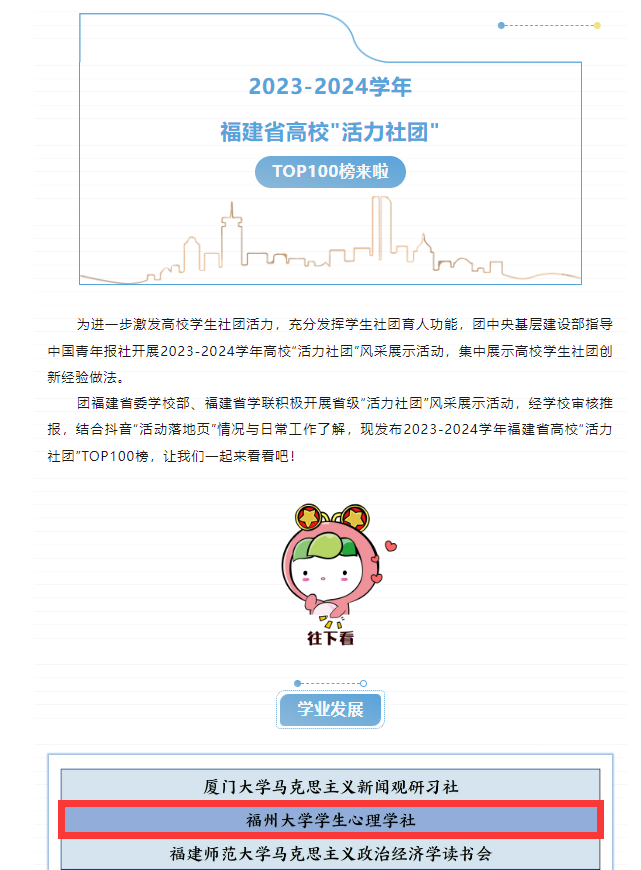 近日,团福建省委学校部、福建省学联发布2023-2024学年福建省高校“活力社团”TOP100榜,人文学院心理学社(学业发展类)入选榜单!