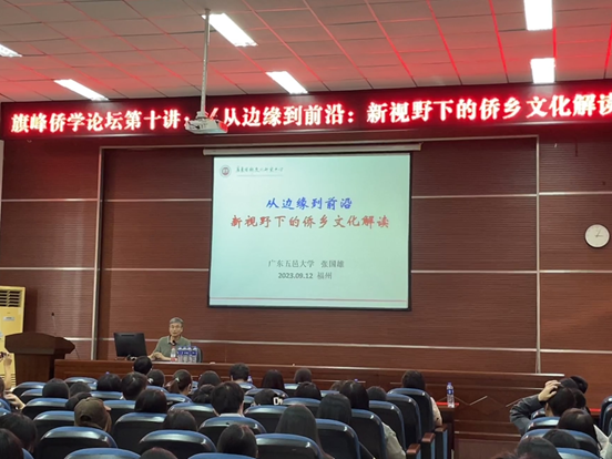 副院长林胜教授主持。张国雄教授作了《从边缘到前沿:新视野下的侨乡文化解读》的主题讲座,对新时代的侨乡文化进行了全新的解读。张春旺所长作了《侨联·侨务·侨情》的主题讲座,让同学们对侨联、侨务、侨情有了更为准确、系统的了解与把握。讲座的最后,张春旺所长向同学们发出号召,呼吁同学们能够积极投身华侨华人以及侨务工作研究等领域,发挥专业所长,为新时代党的侨务事业发展添砖加瓦。