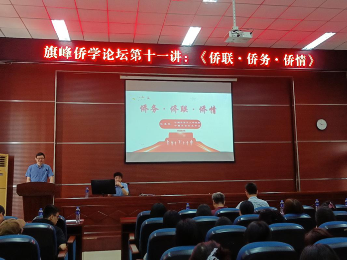 主办的旗峰侨学论坛第十一讲在人文学院艺术实践基地顺利进行。本次侨学论坛邀请到中国华侨华人研究所所长张春旺作为主讲人,为广大师生们带来以“侨联•侨务•侨情”为主题的讲座。人文学院副院长林胜教授主持本次讲座。人文学院党委王群书记、五邑大学原副校长张国雄教授出席了此次活动。