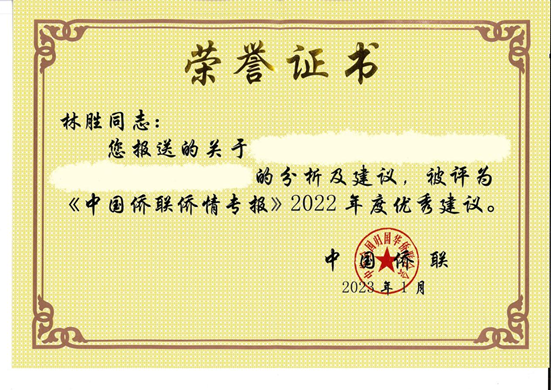 研究中心主任林胜教授的某一建议荣获中国侨联侨情专报2022年度优秀建议表彰。福建省仅两家单位获得此殊荣。林胜教授荣获中国侨联优秀建议奖,体现出中国侨联对福州大学智库研究工作所取得的成果的肯定。