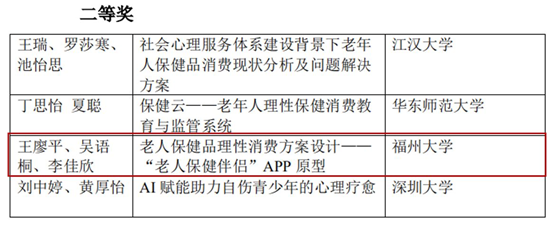 决赛当日,大四学生王廖平带领大三学生李佳欣和大二学生吴语桐在24小时内设计完成大会抽签获得的现场命题“解决老人在购买保健品不理性行为”的现实问题,创新性提出构建“老人保健伴侣”app实现老年人保健品理性消费的现实问题,在“现实问题解决”分论坛中荣获二等奖。通过这次比赛锻炼了同学们的专业能力,所有参赛选手在本次比赛中受益匪浅,专业自信油然而生。