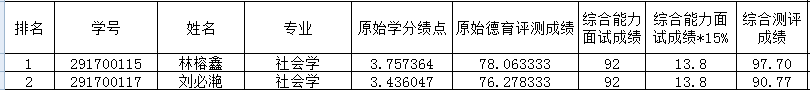 备注:综合测评成绩=(被推荐学生学分绩点值/本专业第一名学生学分绩点值)×100×80%+综合能力面试成绩×15%+德育测评成绩×5%