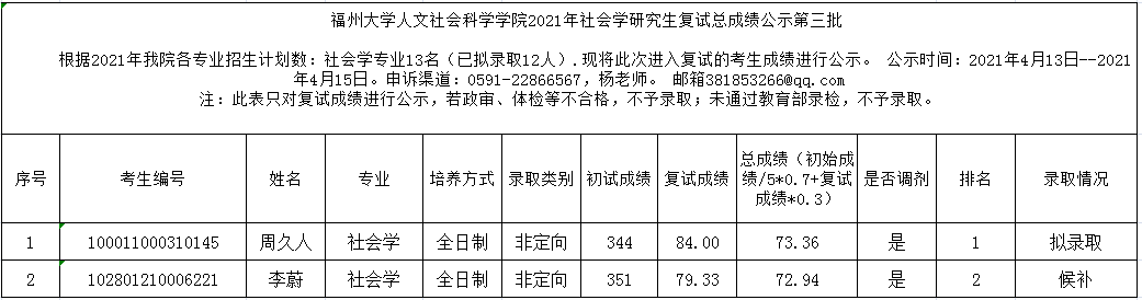 根据2021年国产av视频 各专业招生计划数:社会学专业13名(已拟录取12人).现将此次进入复试的考生成绩进行公示。