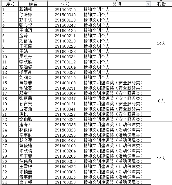 精神文明建设奖宿舍文明类评选实施办法(试行)》,经学生本人自愿申请、年级审核、学院讨论研究,拟推荐蒋销柳(291500316)等68人为人文学院2017-2018年第二学期单项奖学金拟推荐名单,并上报学校。现将具体名单予以公示,公示期3天(2018年6月29日至2018年7月1日)。公示期内,如有异议,请联系学工组王老师,联系电话:0591-22866571。