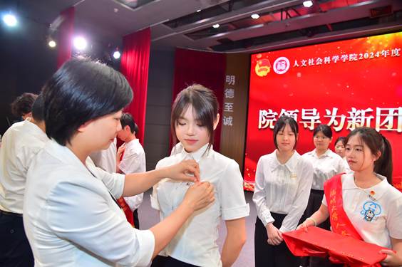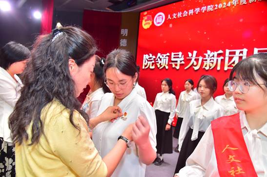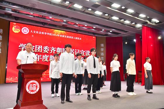大会最后举行新团员入团仪式。院团委书记齐朝阳宣读2024年度新发展团员名单并主持仪式。学院领导老师为新团员佩戴团徽后,新老团员共同宣誓。