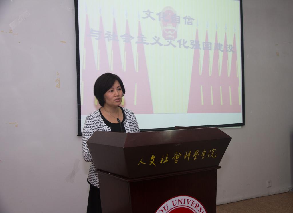 党委委员、副院长梁桂芳副教授做“文化自信与建设社会主义文化强国”主题演讲。全院教职工和部分学生党员、入党积极分子约120人参加了报告会。报告会由院党委林秋生书记主持。
