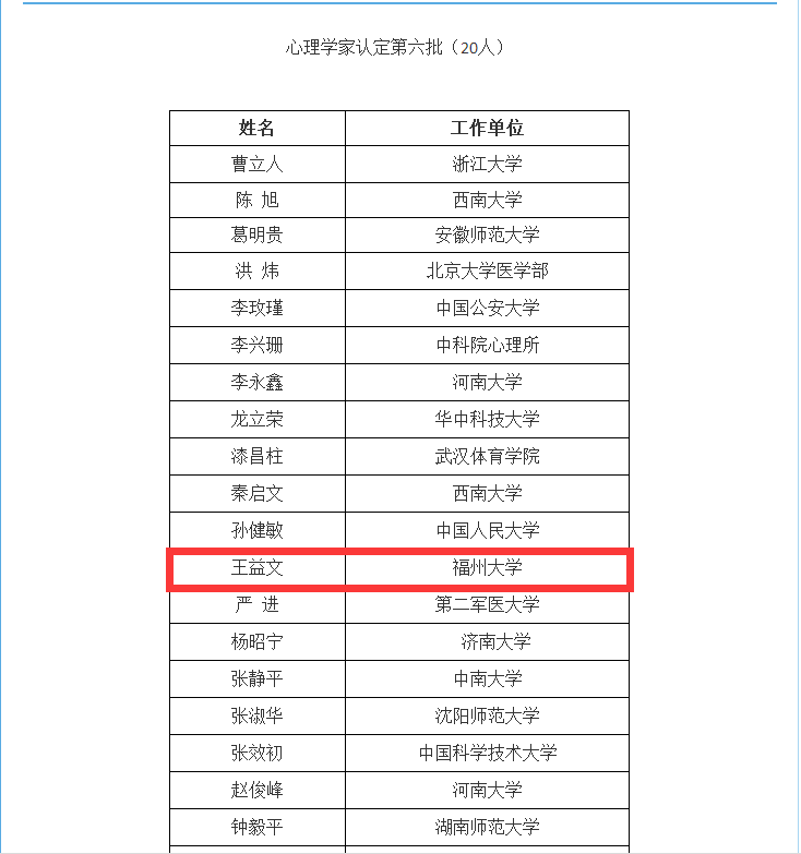 根据《中国心理学会对心理学家进行认定的决定》相关规定,经中国心理学会心理学家认定工作小组评审、常务理事会审议,国产av视频 福建省“闽江学者”特聘教授、应用心理学系王益文教授通过了中国心理学会心理学家认定,成为第六批“中国心理学家”。