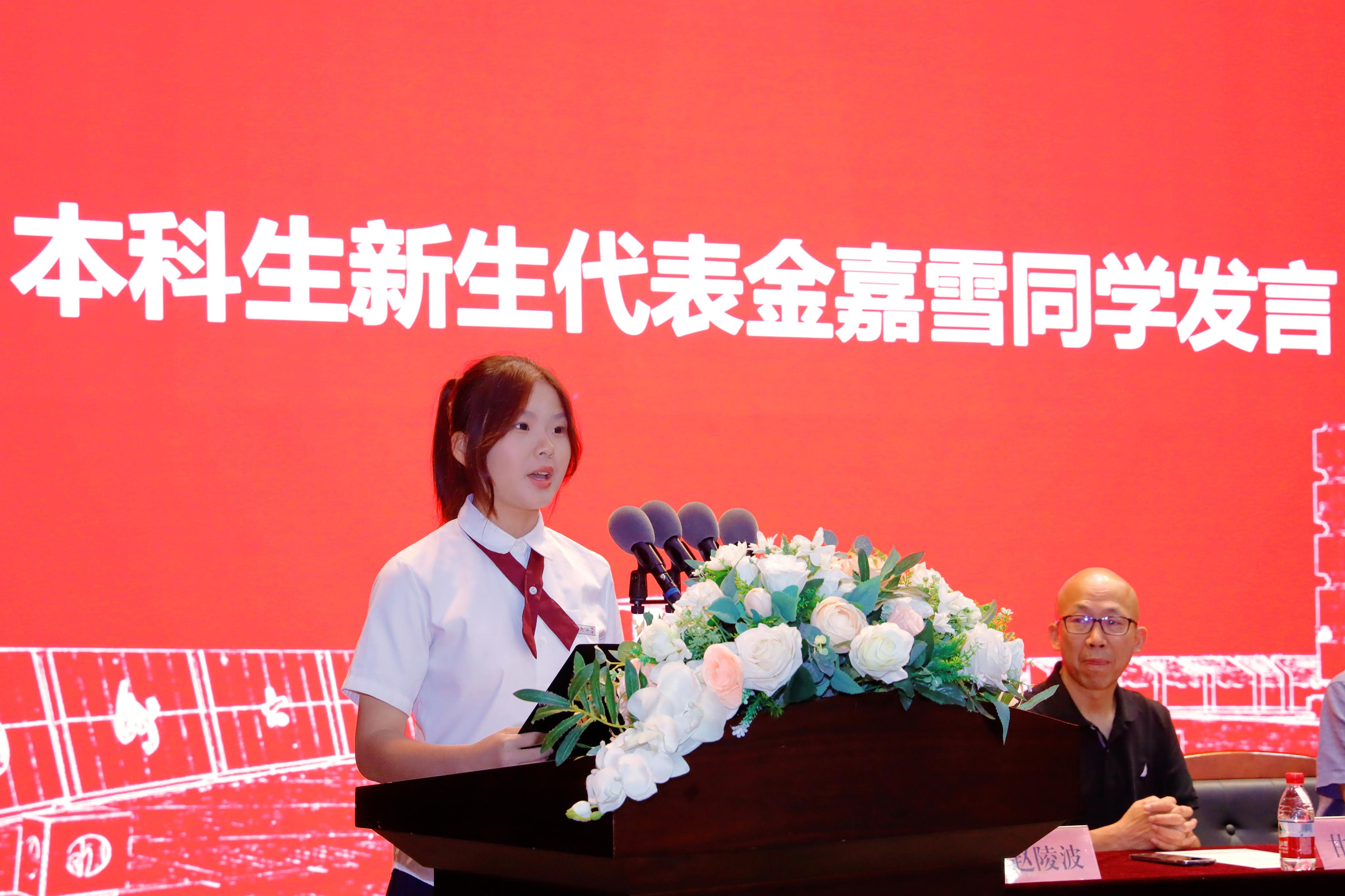 全体人员起立庄严奏唱国歌毕,2023级本科新生代表金嘉雪同学、研究生新生代表刘双同学依次上台发言。