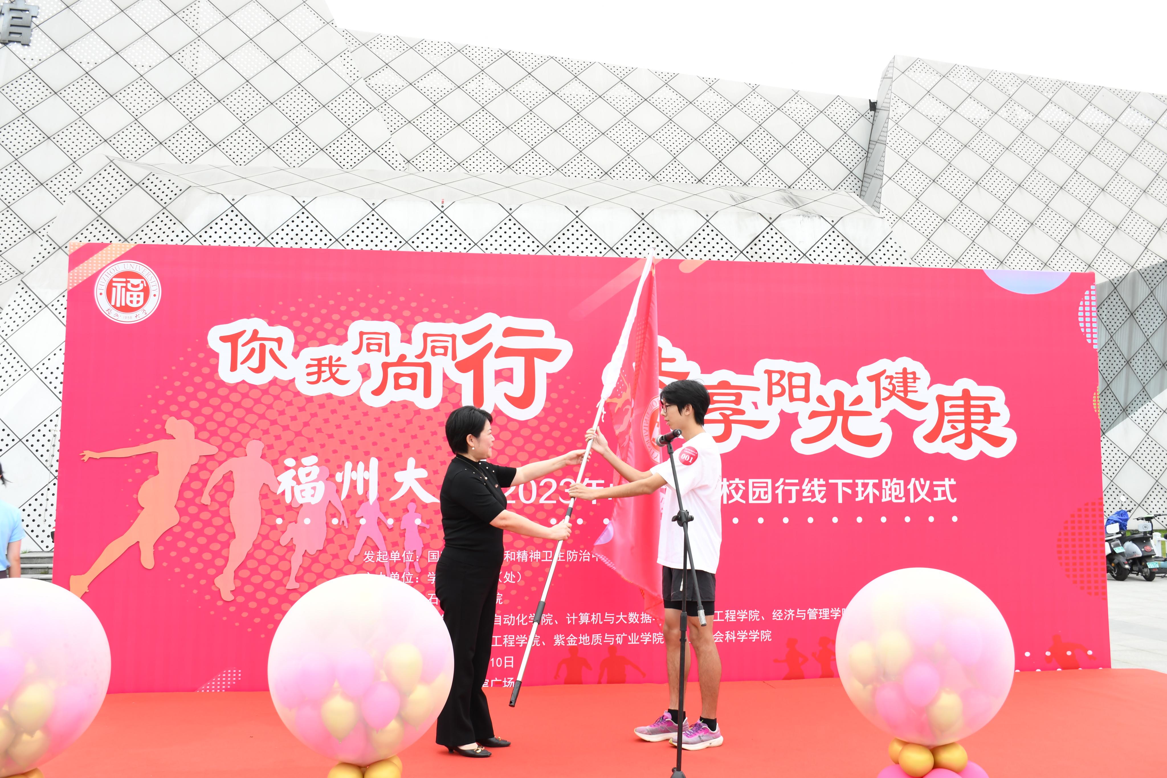 随后,学生工作部(处)部(处)长张红老师为本次活动的领跑员周宇翔同学授旗。出席本次活动的嘉宾共同放飞环跑气球,预祝活动取得圆满成功。