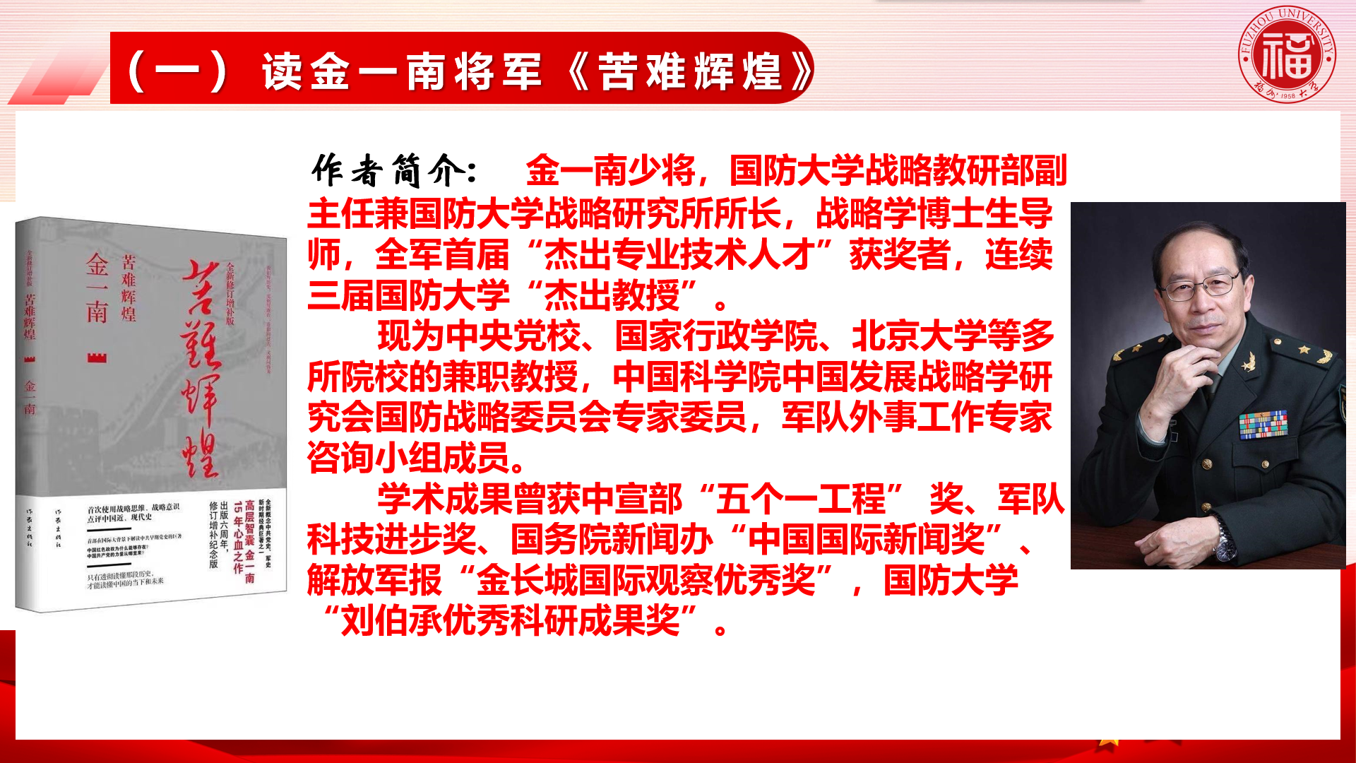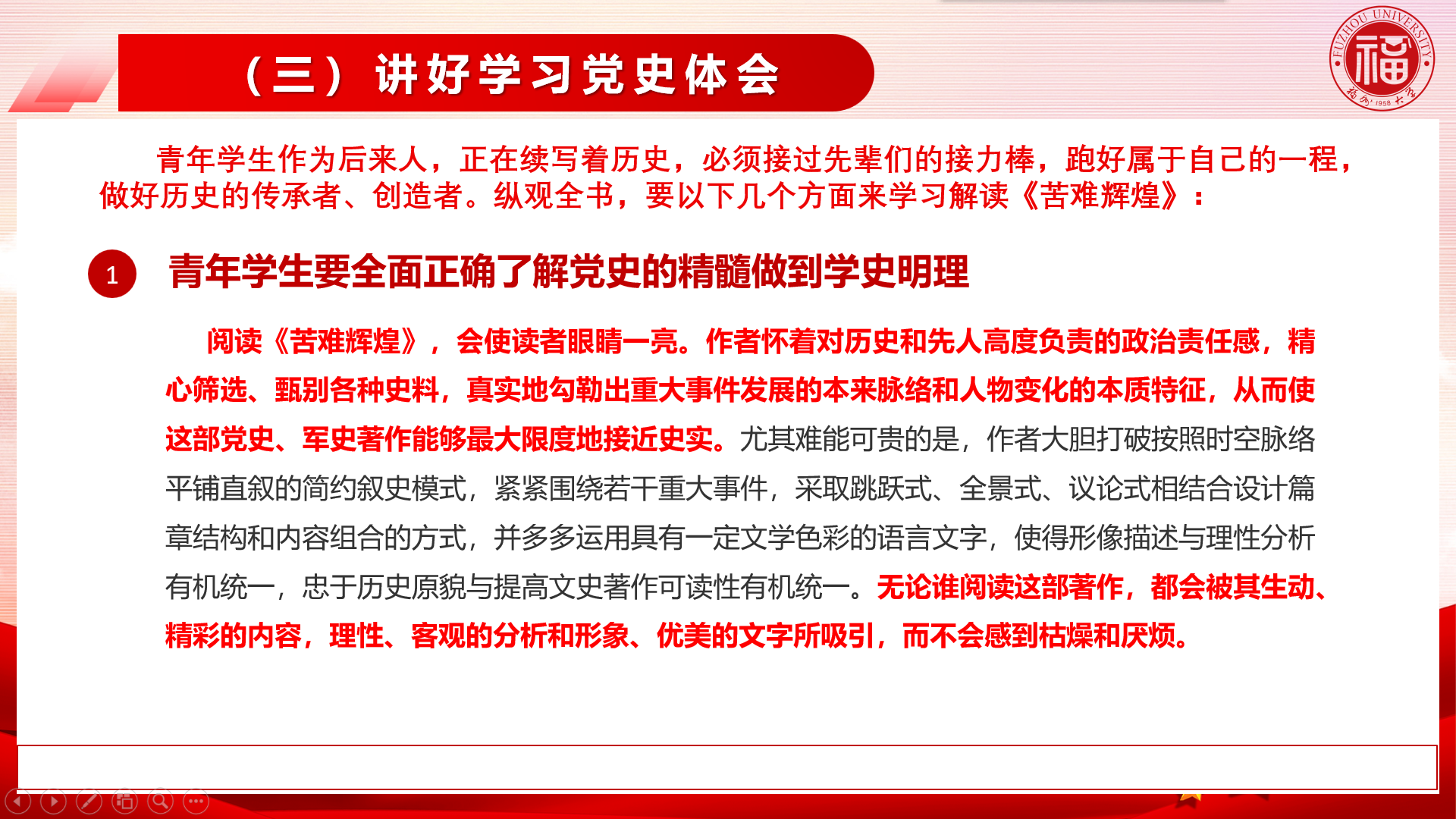 陈少平研究员分享了阅读《苦难辉煌》的心得体会,指出要从六个方面来解读这一经典作品。一、青年学生要全面正确了解党史的精髓,做到学史明理;二、中华民族走向复兴必须进一步凝聚信仰的力量;三、坚持实事求是是党领导中华民族走向复兴的思想保证;四、坚持以人民为中心是党领导中华民族走向复兴的坚强保障;五、实现中华民族伟大复兴寄希望于青年一代的奉献与奋斗;六、回望历史,明确方向,凝聚力量,继续出发。