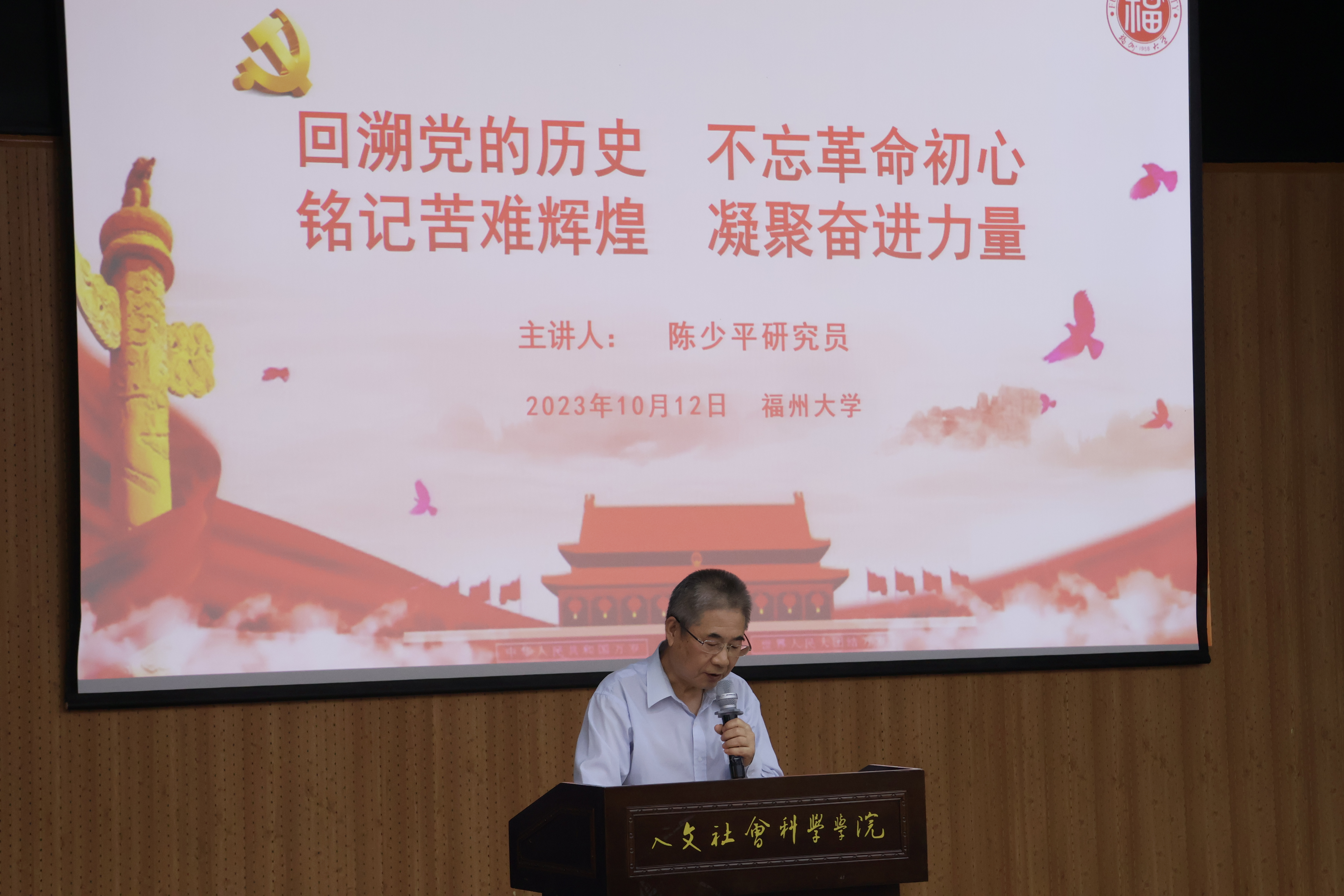 关工委常委副主任陈少平研究员受邀为人文学院2023年“青马工程”大学生骨干培训班作《回溯党的历史,不忘初心使命,铭记苦难辉煌,凝聚奋进力量》主题讲座。陈少平研究员按照“党中央要求”“如何学党史”“读红色经典”“学党史践行”脉络,结合金一南少将著作《苦难辉煌》,为学员们授课。