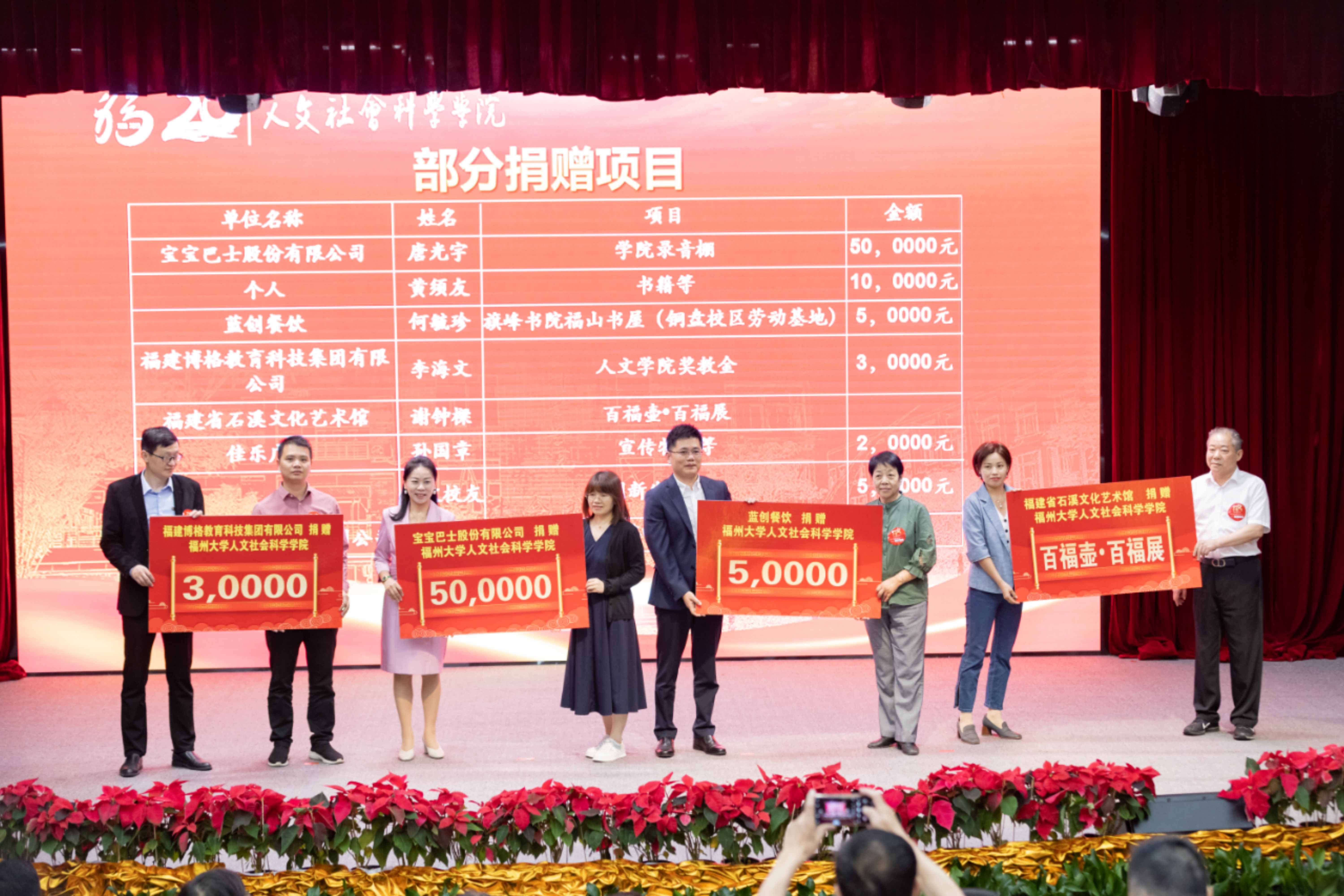 随后,举行校友捐赠仪式。在院庆期间,宝宝巴士股份有限公司、蓝创餐饮、福建博格教育科技集团有限公司、福建省石溪文化艺术馆、佳乐广告等单位慷慨解囊,捐款捐物,为学院发展添砖加瓦。此外,人文学院创新发展基金捐赠达871人次,累计金额超过五万元。涓涓细流汇成浩瀚江海,点滴爱心凝聚奋进力量。