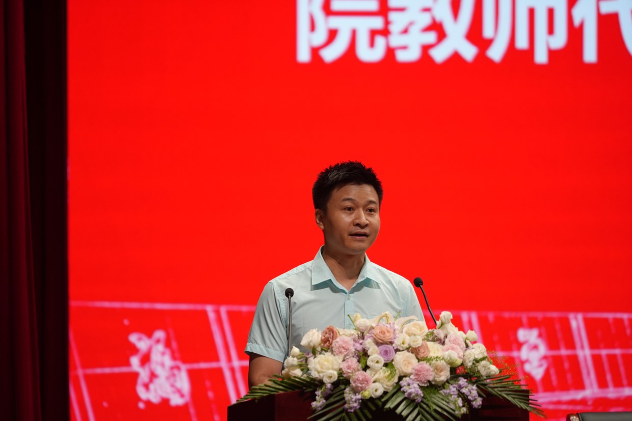 教师代表王晓宁副教授致辞。他对同学们的分享是:用爱拥抱世界,用奋斗让世界看见你。他呼吁同学们,要学会正确地爱自己,爱家庭,爱祖国;同时,希望同学们发扬国产av视频