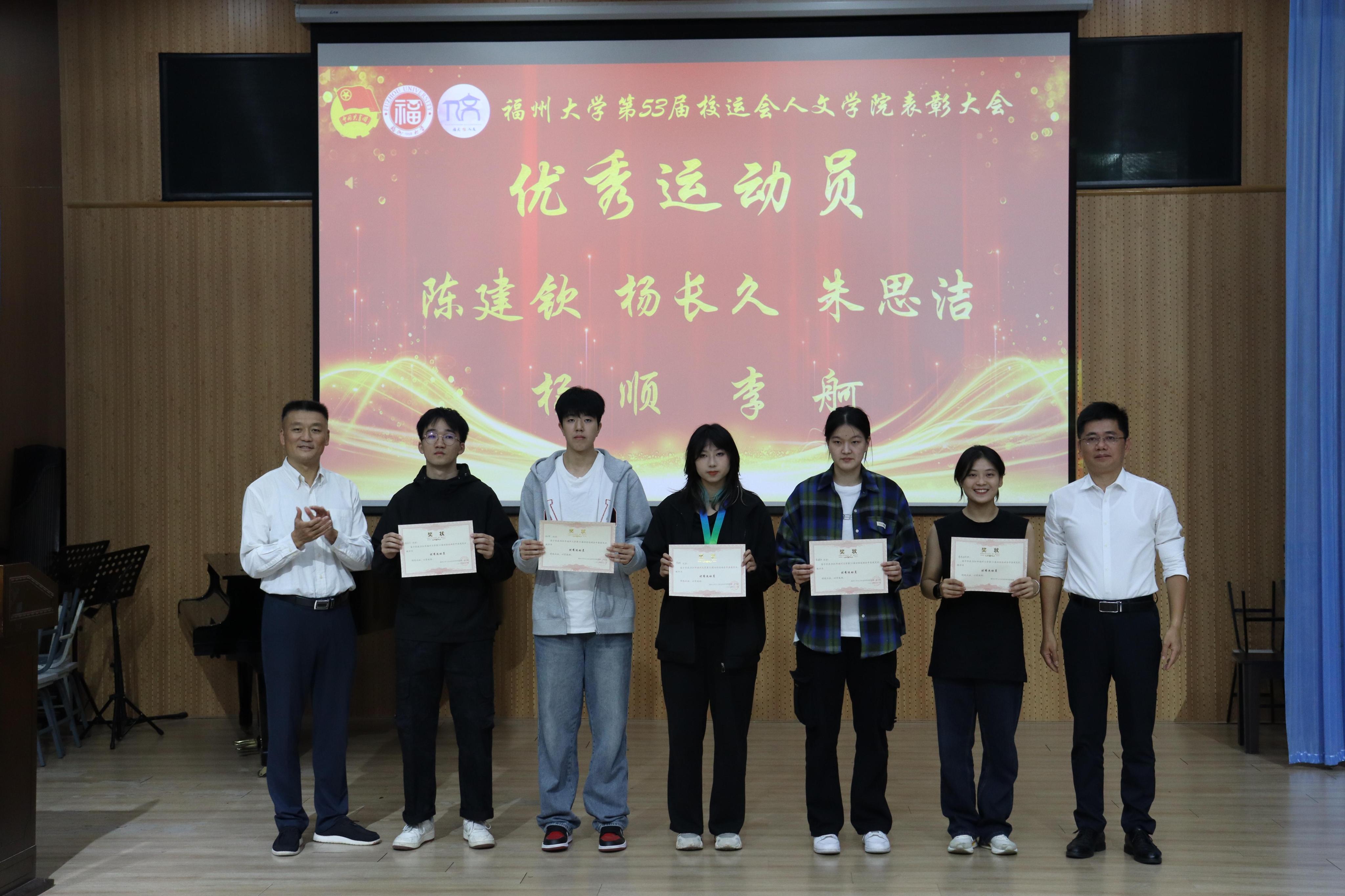 11月9日晚,人文学院校运会总结表彰大会暨团委、学生会迎新晚会在学院艺术实践基地举行。学院党委书记王群、党委副书记陈永福、团委书记齐朝阳、辅导员丁雅莉、谢婉婷出席活动。会上,王群书记、陈永福副书记为优秀运动员、优秀后勤颁发奖状。
