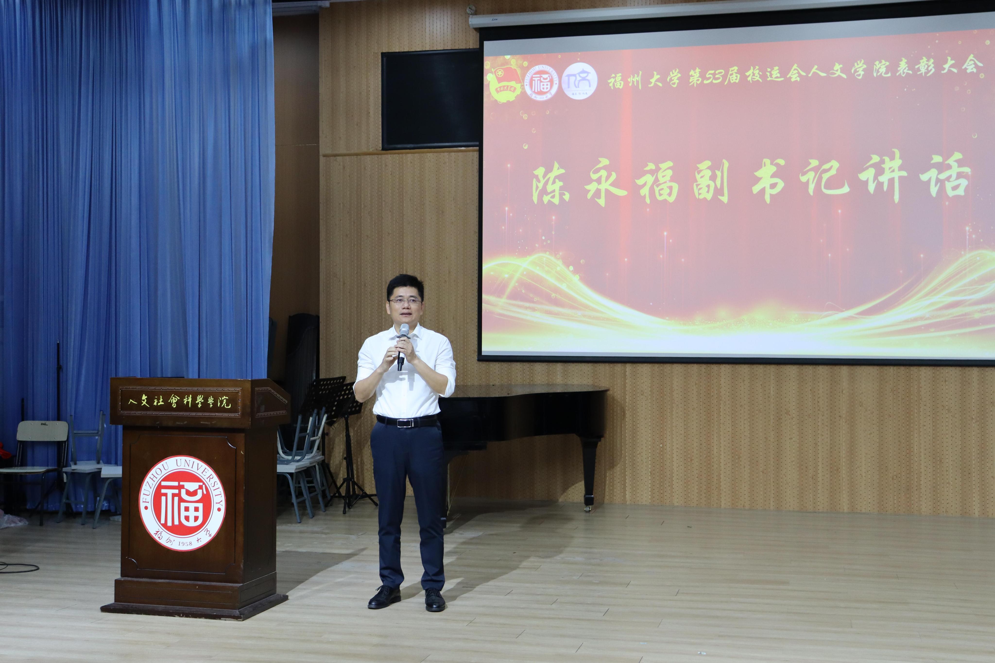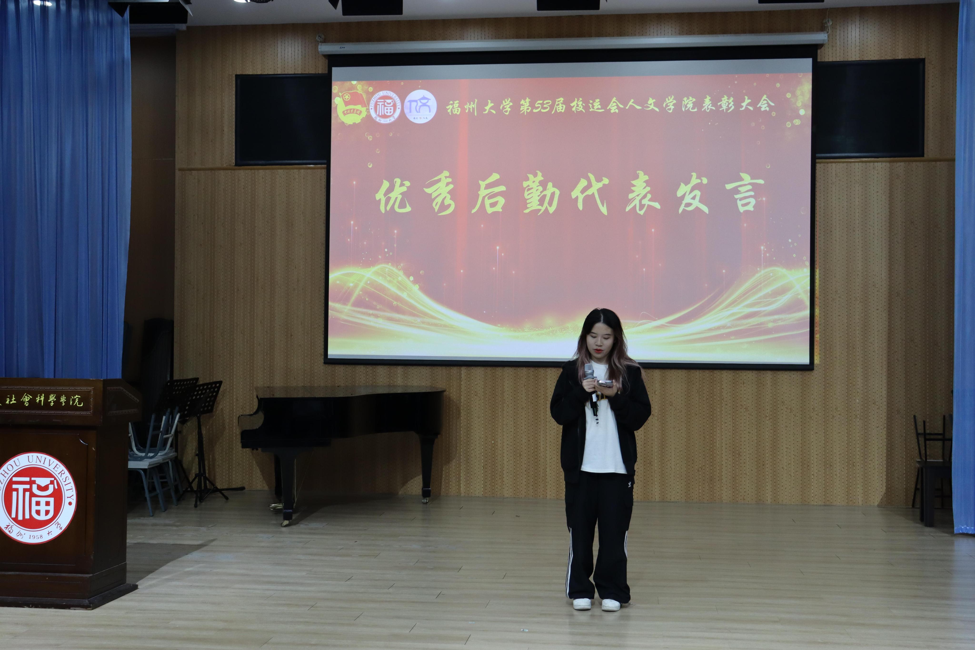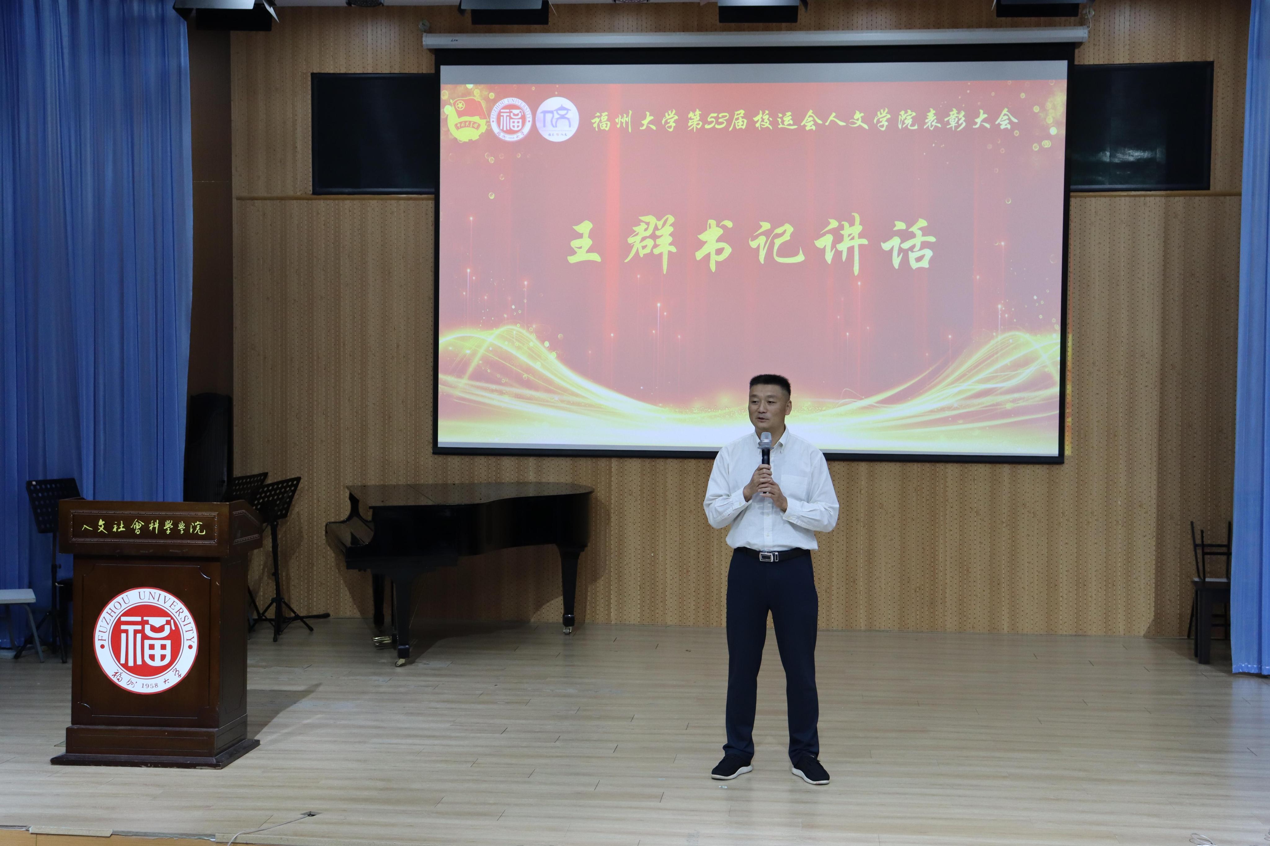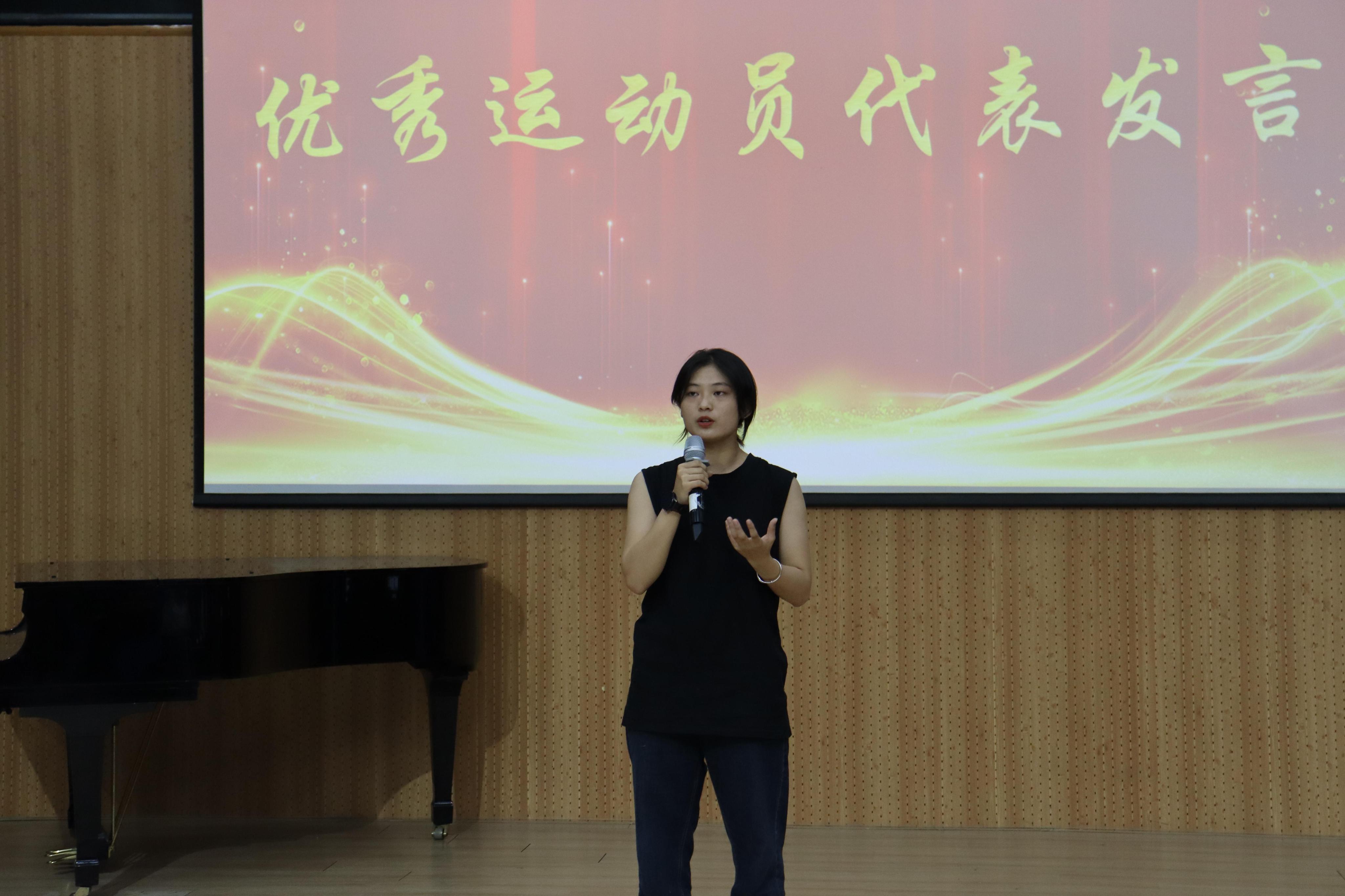 优秀运动员代表朱思洁同学和优秀后勤代表黄麒羽同学先后发言,结合自身经历,表达所想所悟。随后,陈永福副书记致辞。他对同学们表示“感谢”“期待”和“祝愿”,肯定了人文学子敢于突破的体育精神,期待同学们认真总结,争取更好成绩,并祝愿同学们不断进步,学院工作取得更优成果。王群书记作总结讲话,对学院同学们提出期望。一是希望同学们保持永不言弃的精神,在人生的不确定中抱有“坚持就是胜利”的信念。二是希望同学们深耕团队精神,在交流合作中学会付出。最后,王群书记祝愿大家未来更加美好、学院未来更加辉煌。