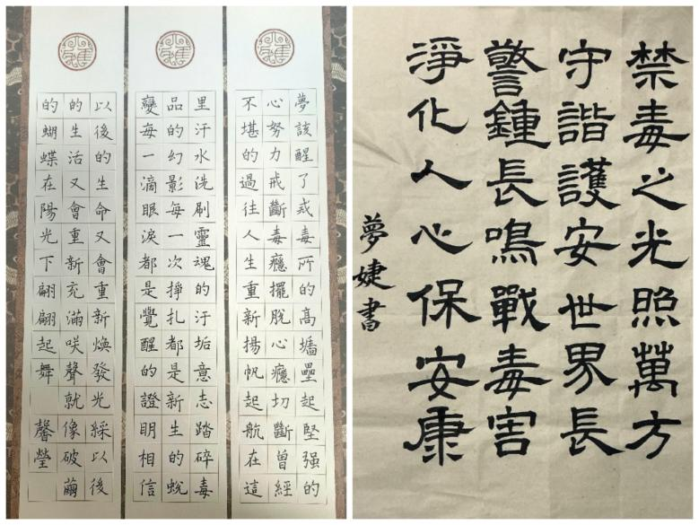 11月16日至11月22日,人文学院志愿服务部开展禁毒防艾主题优秀作品征集活动。隽永秀丽的书法,饱含深意的绘画……人文学予以文艺形式表达坚定的禁毒防艾决心。