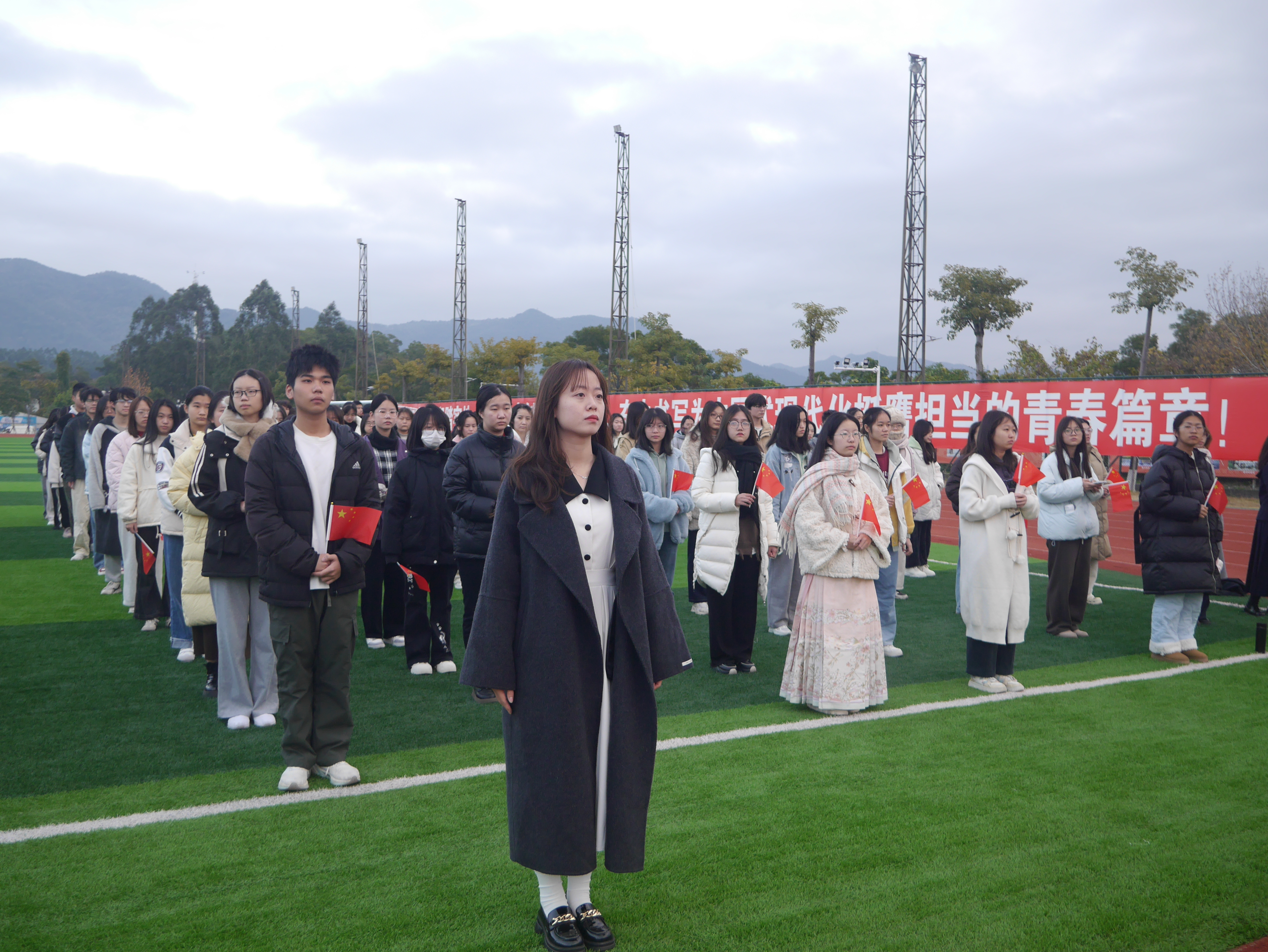 为厚植爱国情怀,展现青春朝气,12月30日,由国产av视频 和建筑与城乡规划学院联合承办的升旗仪式于铜盘校区田径场顺利举行。人文学院辅导员谢婉婷、建筑学院辅导员李金烨出席本次仪式。