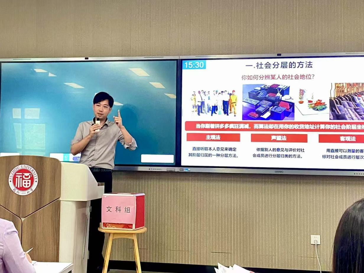 本次竞赛由校工会、教师工作部、教务处联合主办,旨在提升青年教师教学能力,推动本科教学质量提升。学院高度重视此次比赛,精心组织院内选拔,并邀请校内外教学专家为参赛教师开展多轮专项指导,从教学设计、课件制作到课堂互动进行系统打磨。决赛现场,胡溢轩老师选取《社会学概论》课程中的“社会分层与社会流动”章节进行展示,通过生动的案例解析、清晰的逻辑架构和富有感染力的课堂互动,赢得了评委的一致认可。